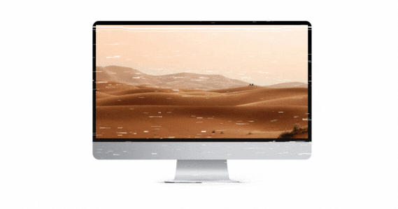 description: a computer monitor with a silver base and black border with a photo of a desert landscape. white lines dance across the surface.